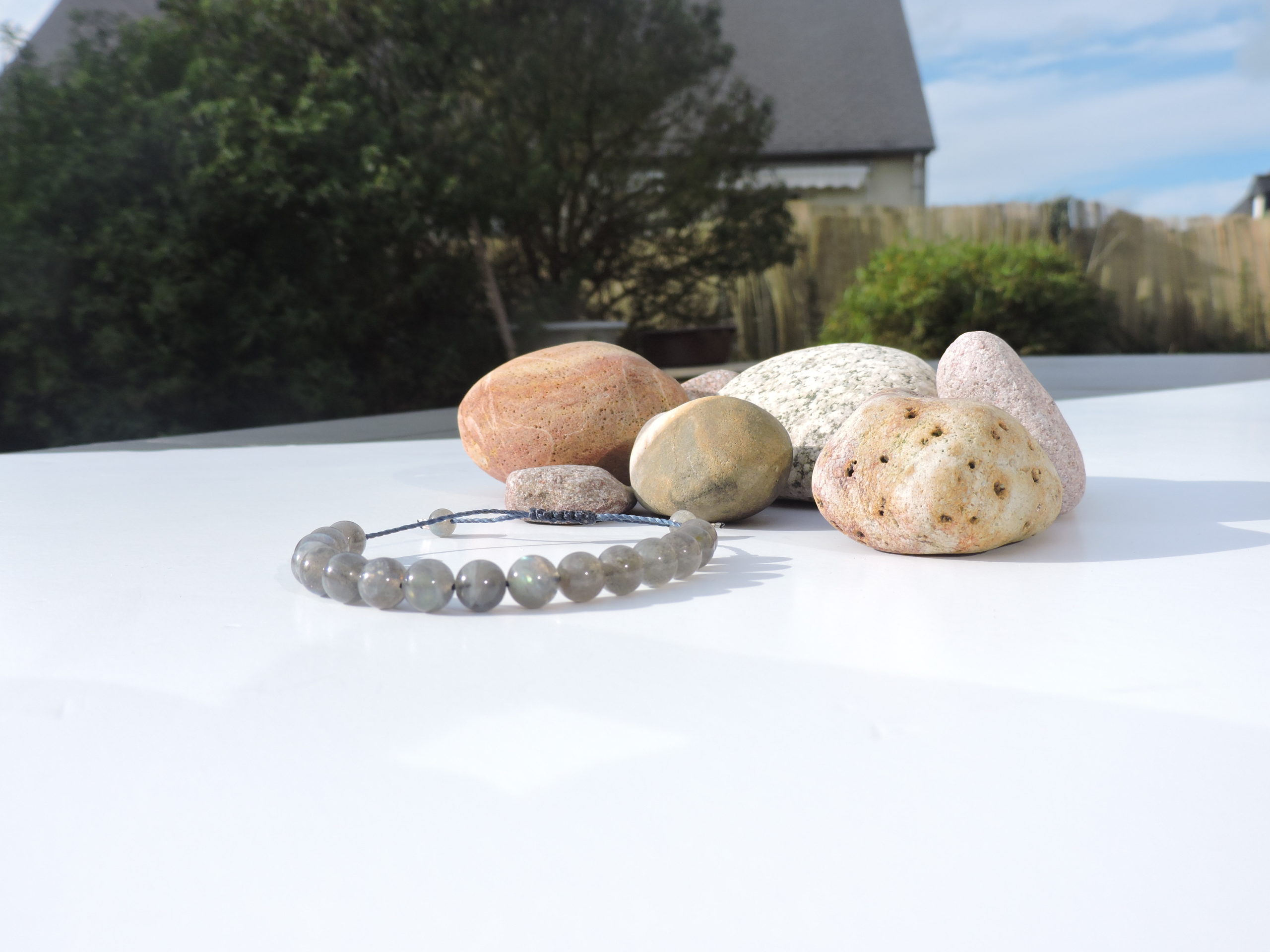 La labradorite est une pierre naturelle aux nuances cendrées avec de subtiles irisations à dominante bleutées, ce qui donne au bracelet élégance et discrétion.